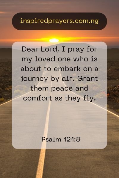 Dear Lord, I pray for my loved one who is about to embark on a journey by air. Grant them peace and comfort as they fly. Surround the plane with Your protection, ensuring a smooth and safe flight. May the pilots, crew, and all passengers be under Your watchful care.