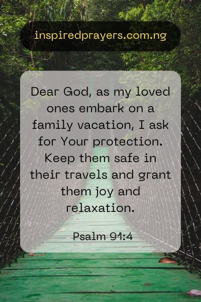 Dear God, as my loved ones embark on a family vacation, I ask for Your protection. Keep them safe in their travels and grant them joy and relaxation. Protect them from any harm or danger.